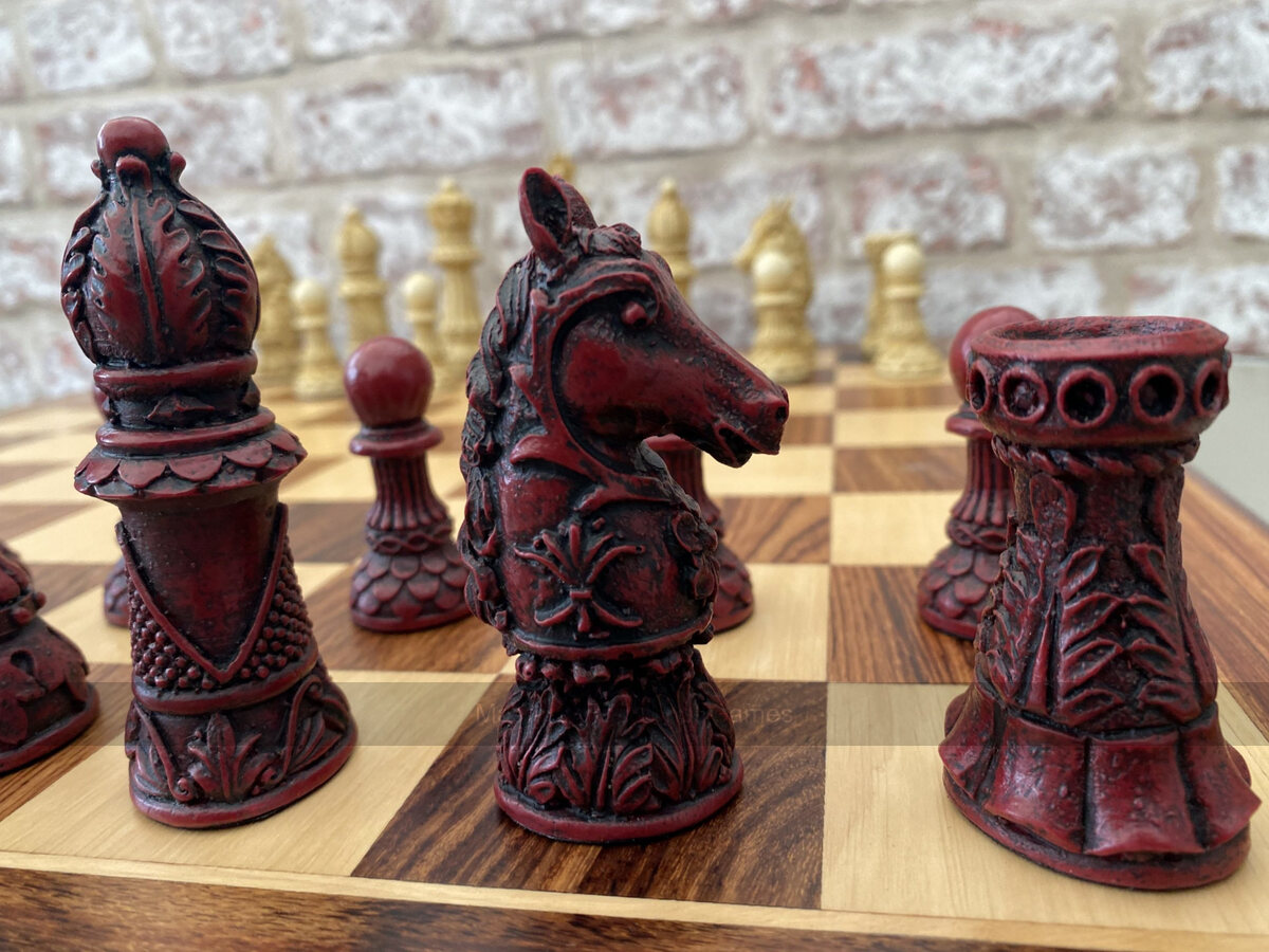 Beautiful set of Ornate Staunton Chess Pieces by Berkeley Chess in Cream & Red or Cream & Brown. This set of intricately detailed Chess pieces are crafted from ground stone resin and feature a 4.25 inch King. All pieces have felt bases and are intricately detailed with delicate shading. Chess sets from Berkeley are better quality than cheaper alternatives, with crisper detailing and a slicker shadowing finish that results in a more genuine looking aging effect.