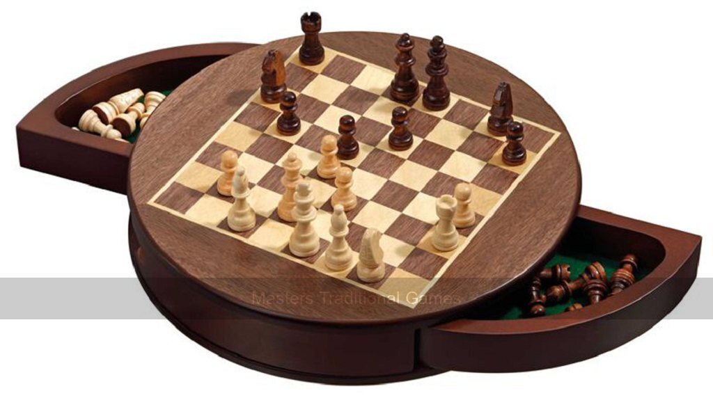 A beautifully made rounded Chess cabinet from renowned games manufacturer, Philos of Germany. The rounded cabinet is constructed from poplar wood with a walnut stain and features maple and walnut inlays. Two drawers house the Chess pieces when not in use.