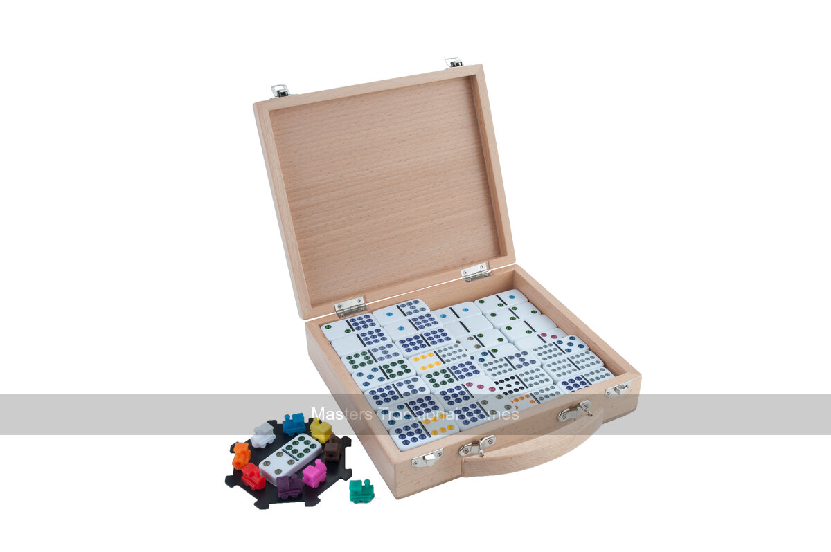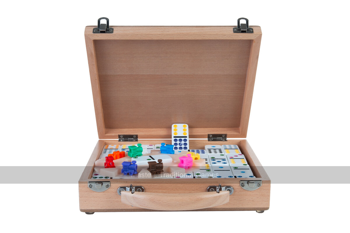 • A Double 12 Mexican Train Domino set in a Beech wood case