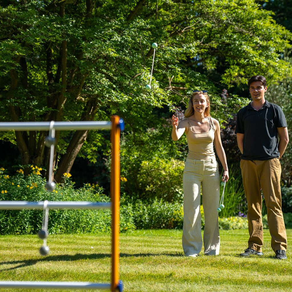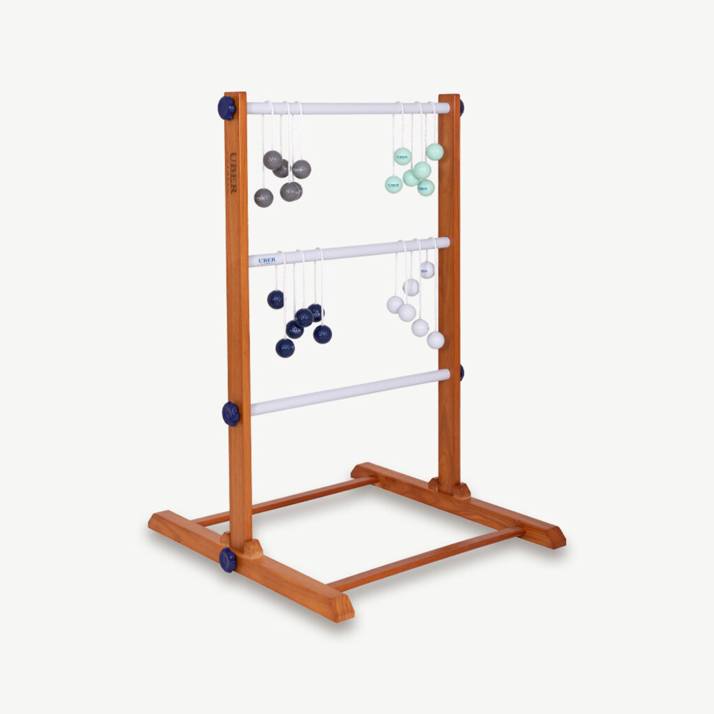 Executive Ladder Golf Set by Uber Games. This Ladder Golf set consists of a Rubberwood frame with 3 durable PVC rungs. Individuals or teams commence by selecting three Bolas (Bolas comprise two golf balls (or soft balls) tethered by a rope) available in Navy, White, Green, or Grey. The hard bolas are made from real golf balls, whilst soft balls are used for the soft bolas, all of which are securely connected at either end of a rope.