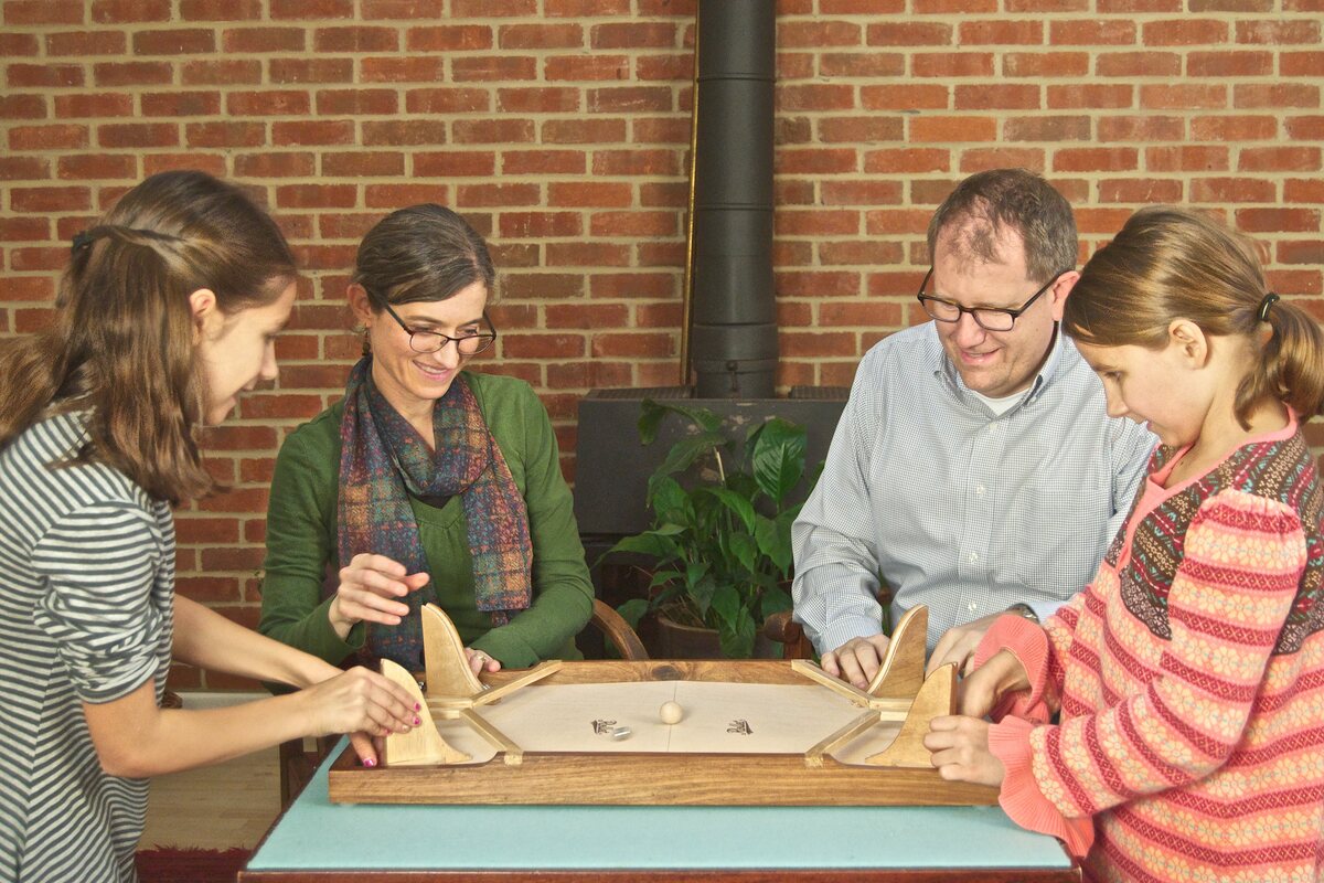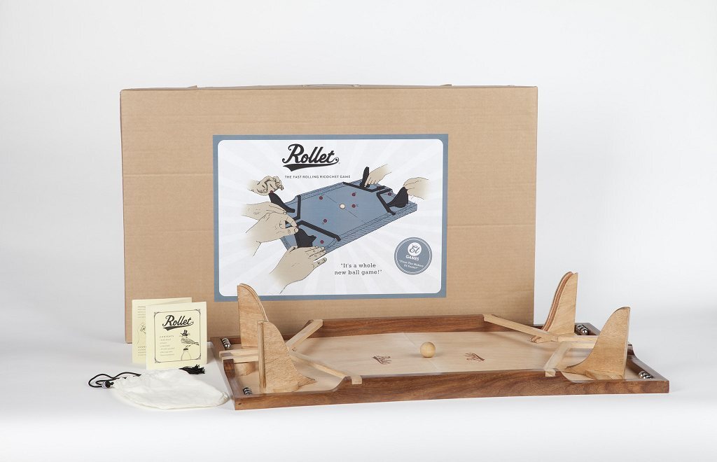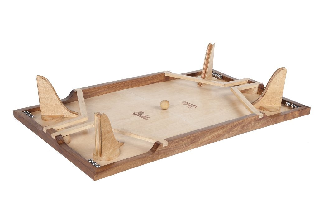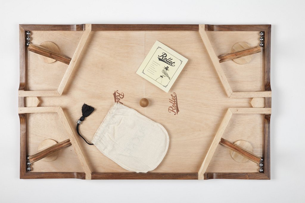 Rollet is a four player fast rolling ricochet game. The aim of the game is to roll steel balls down your chute so as to knock the wooden ball into your opponents’ goal.