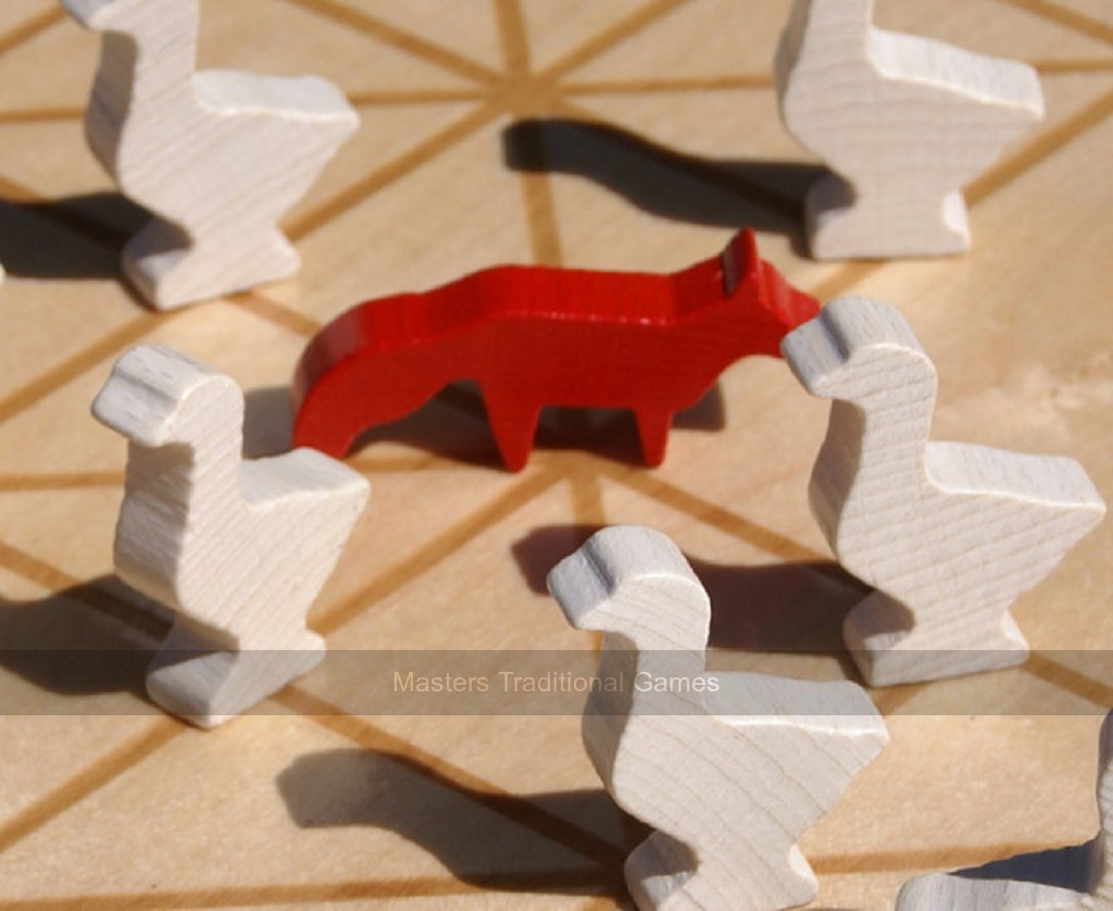 A set of beautifully crafted wooden Fox and Geese pieces.