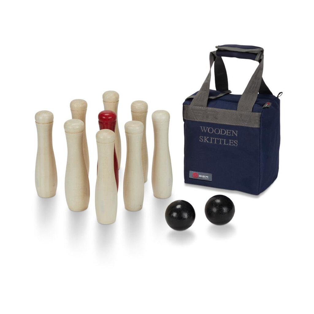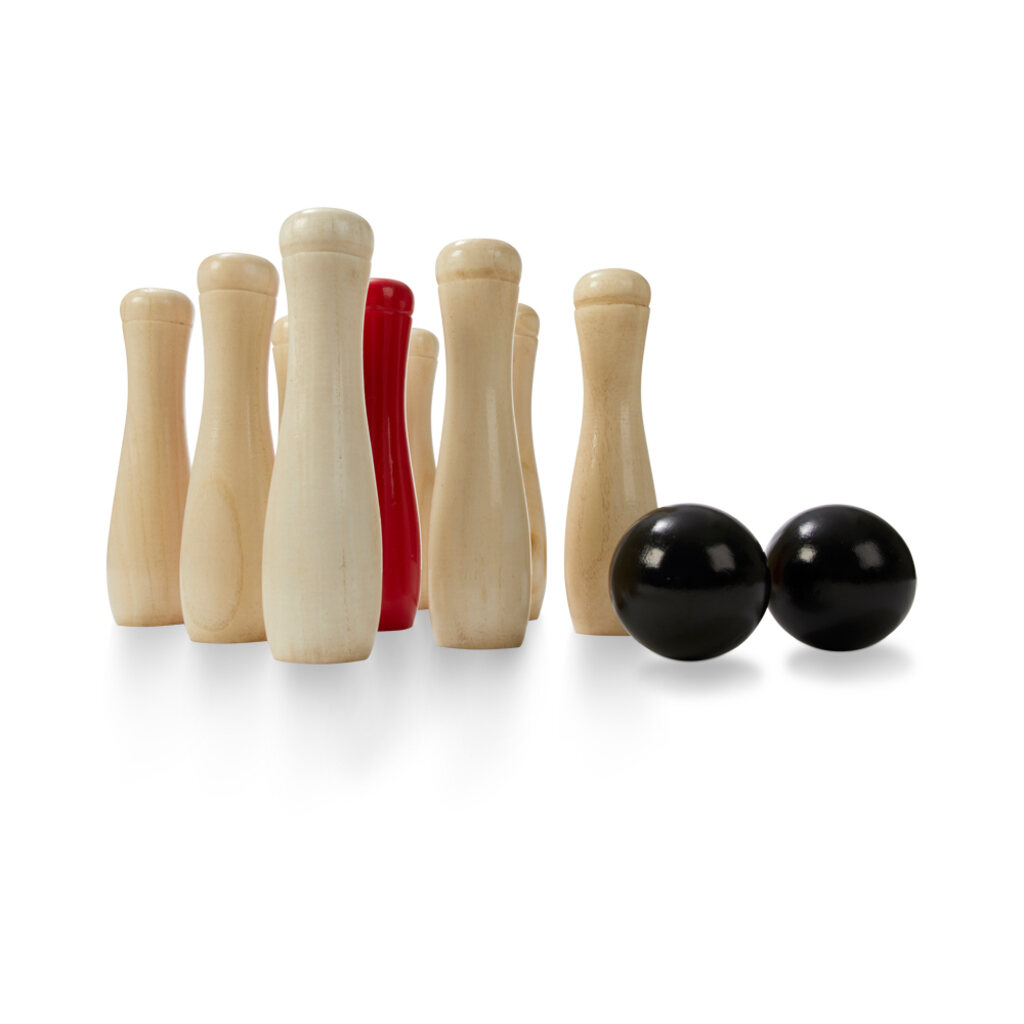 This is an excellent value wooden skittles set; it comes with hardwood skittles and two wooden balls