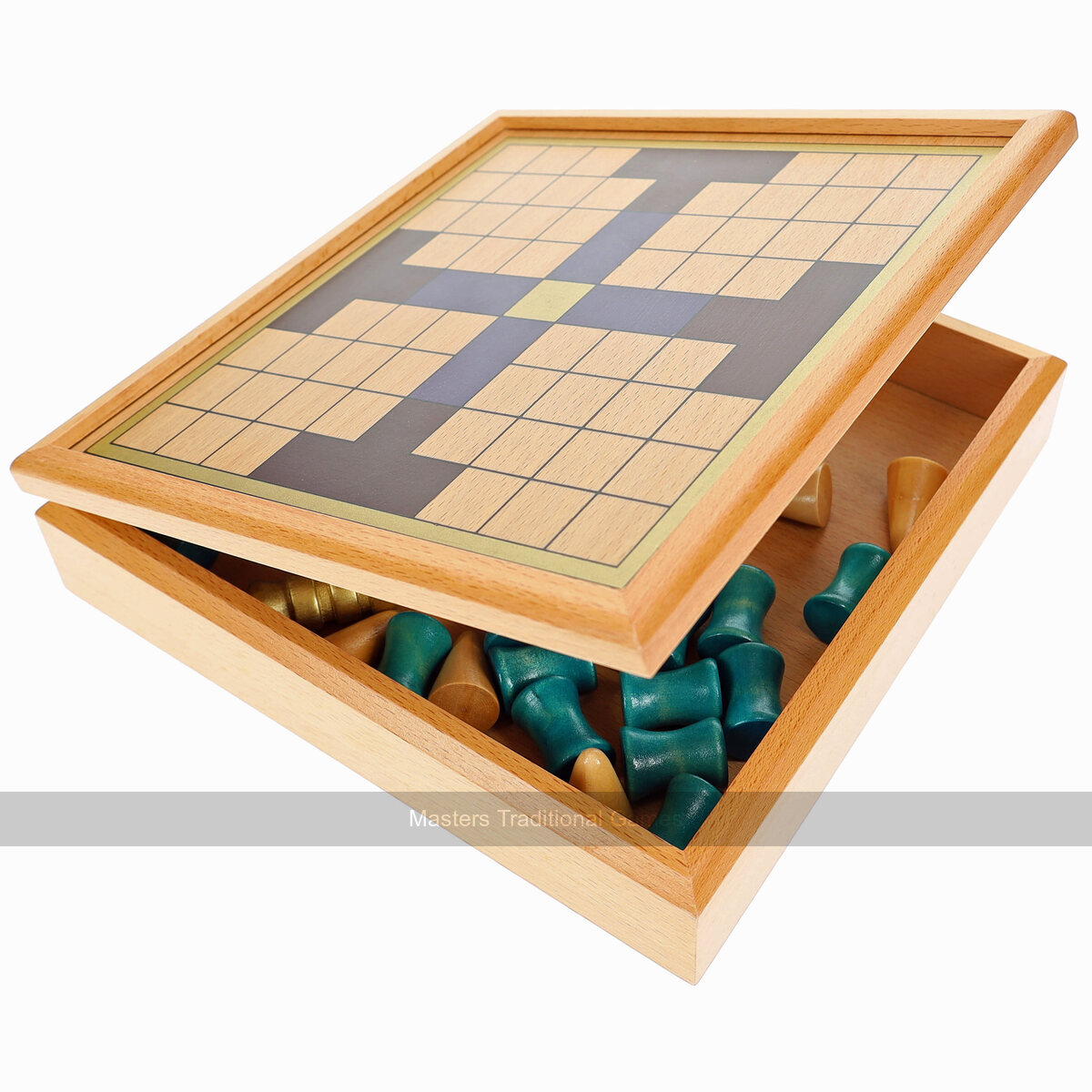 The Tablut box is made from hardwood and measures 22.5 x 22.5 x 5.5cm (9 x 9 x 2.25 inches). The top is hinged and opens so that the pieces and rules can be stored inside the box.