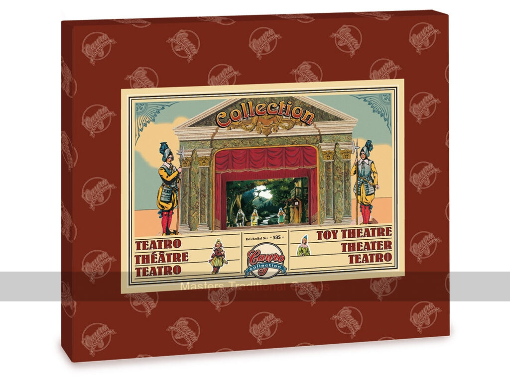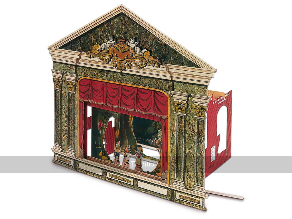 The toy theatre set includes thick, durable and nicely illustrated card components. A stage and theatre facade, numerous characters and multiple backdrops are included, along with a play script.