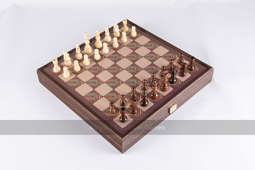 The 4 playing boards feature a printed layout applied to a wooden face; Chess and Backgammon on the exterior, Ludo and Snakes & Ladders on the interior. The compendium is available in a classic brown or contemporary black finish.