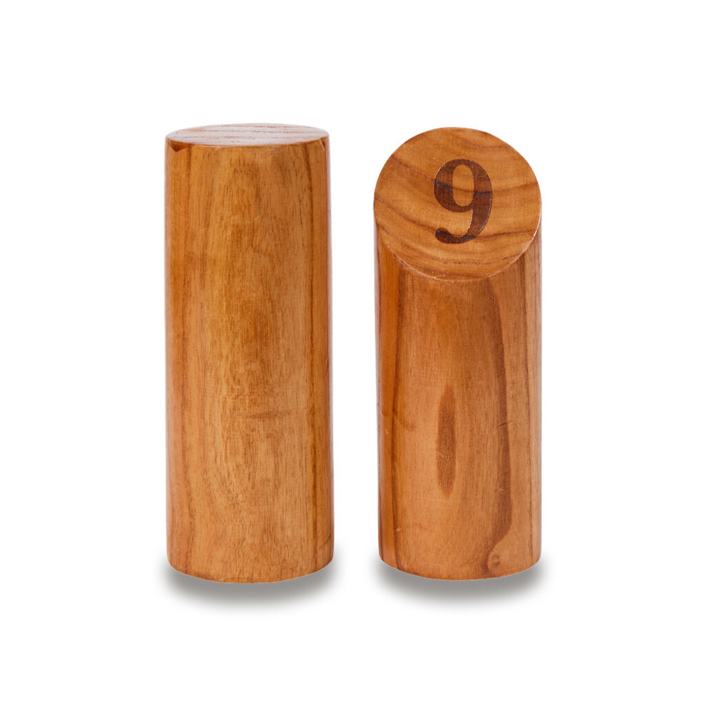 The Uber Wooden Scatter Set comprises 10 pine wood pins (each 17.5cm in height and 7cm in diameter), a throwing stick and a sturdy zipped storage / carry bag.